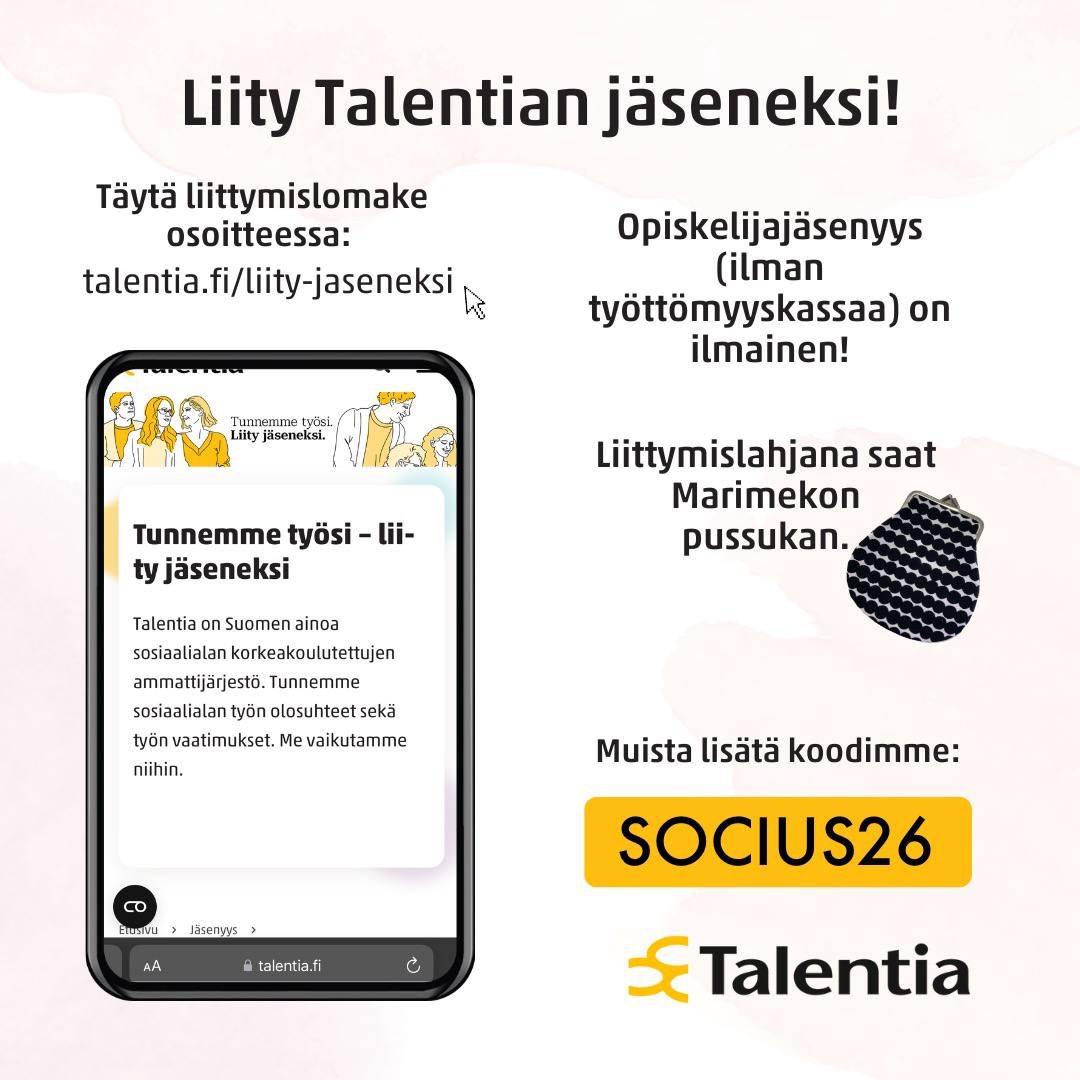 Hei opiskelija, liity Talentiaan! Talentia on Suomen ainoa ammattijärjestö, joka ajaa ainoastaan sosiaalialan korkeakoulutettujen etua. Keskitämme voimavaramme siis 100-prosenttisesti sosiaalialan ja varhaiskasvatuksen työntekijöiden etujen ajamiseen. Talentian opiskelijajäsenyys ilman työttömyyskassaa on täysin ilmainen, ja liittymislahjana saat Marimekon pussukan. Miksi liittyä? Jäsenenä saat mm.: